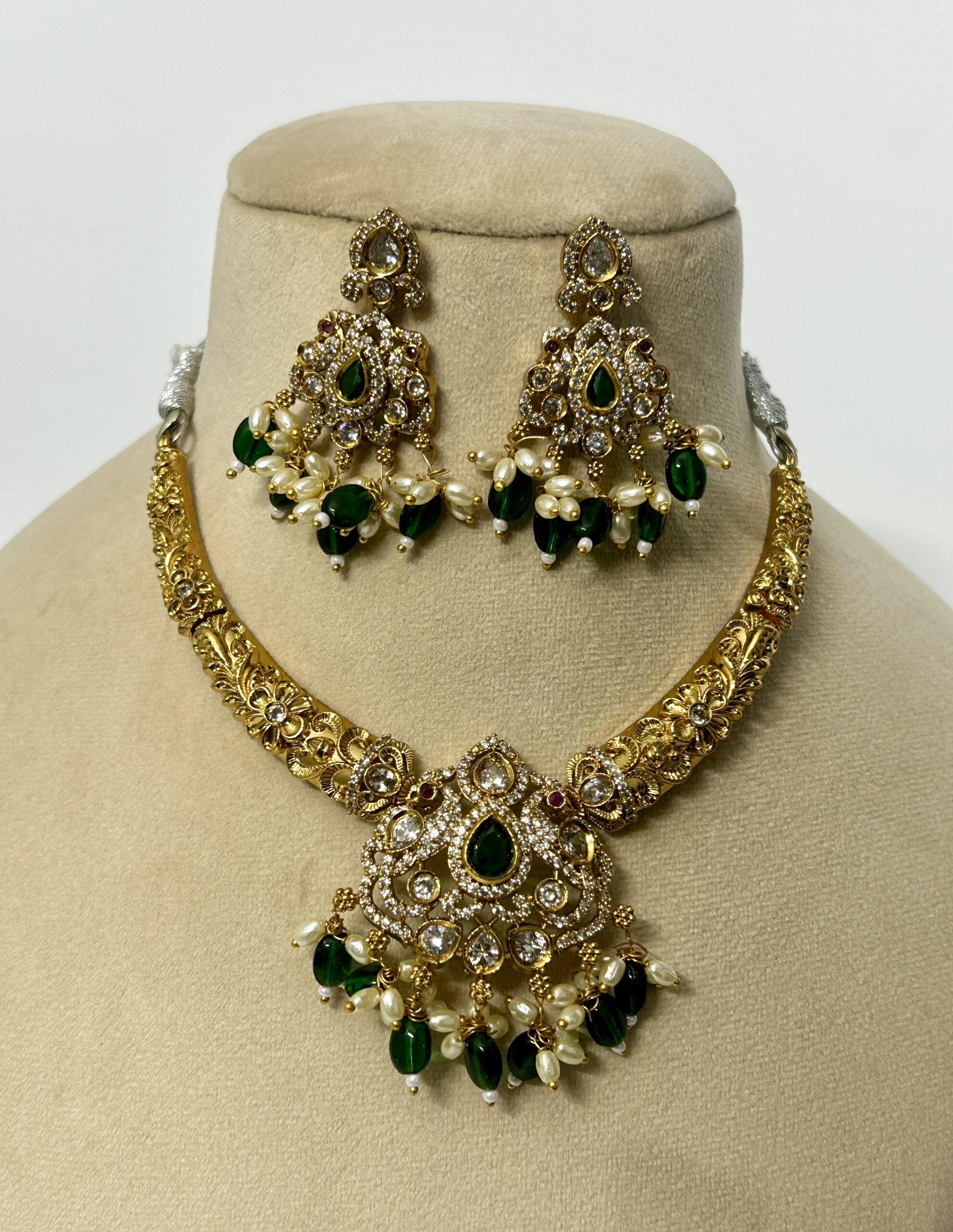 Add a touch of elegance to your look with this Luxury CZ Diamond Look Necklace Set with Earrings. Designed with sparkling cubic zirconia stones and a stunning Gold plated finish, this set is perfect for weddings, parties, and festive occasions.