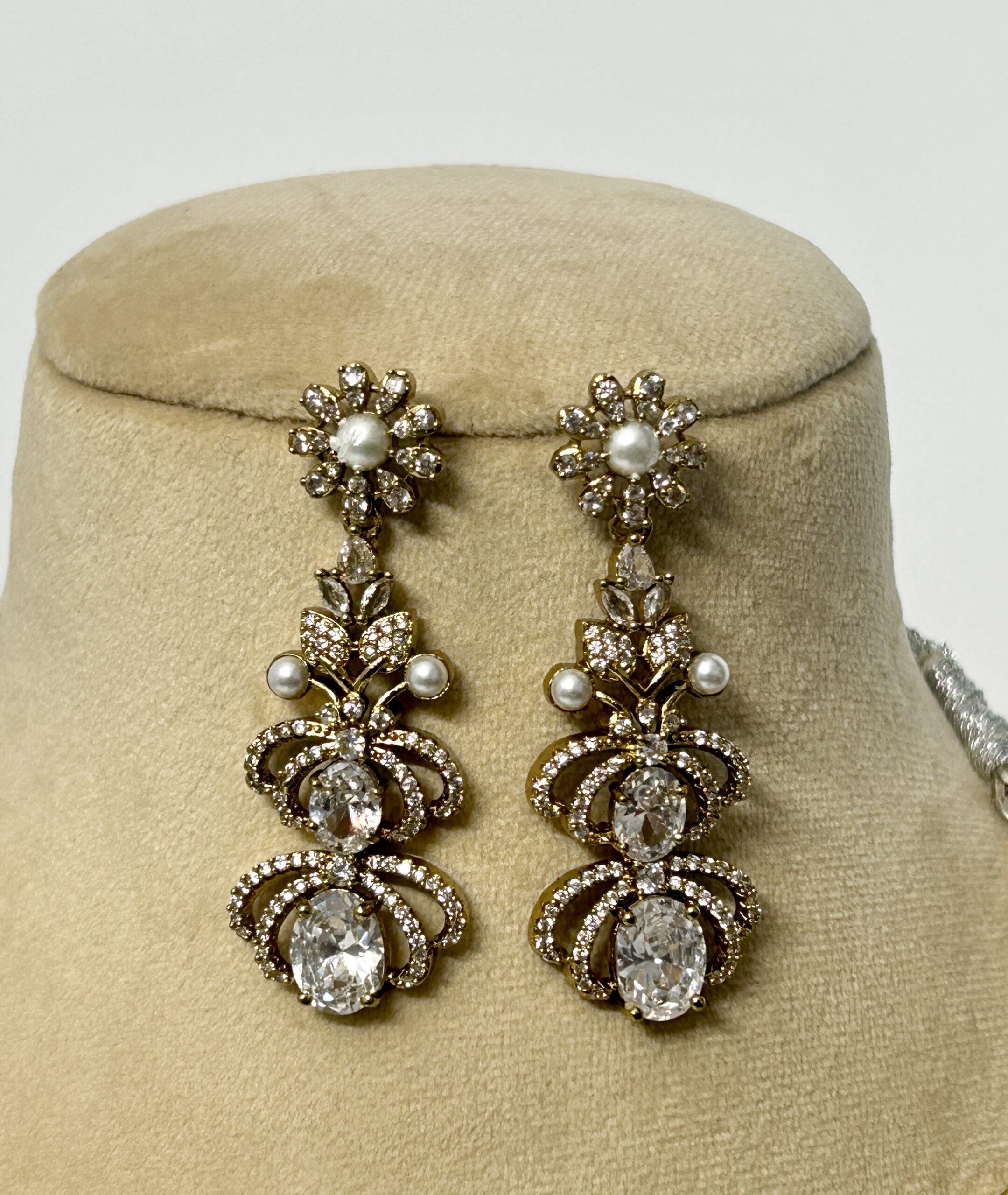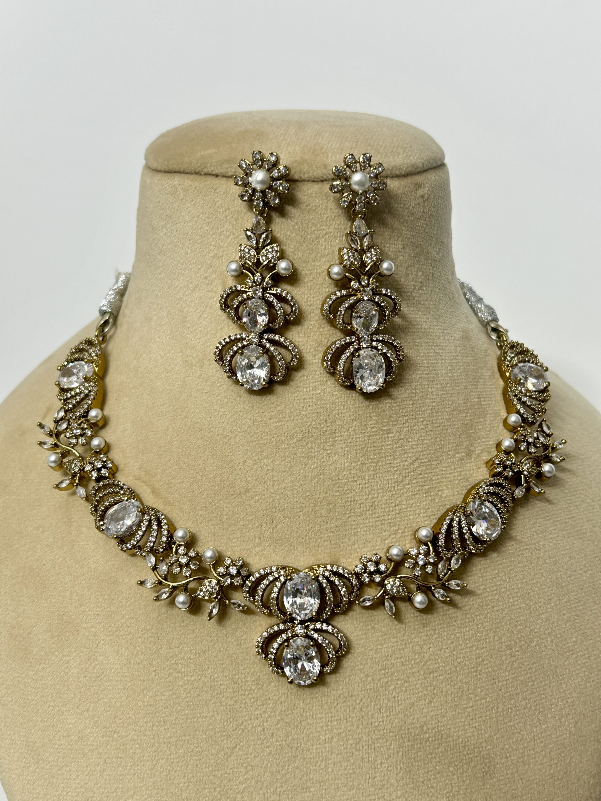 Add a touch of elegance to your look with this Luxury CZ Diamond Look Necklace Set with Earrings. Designed with sparkling cubic zirconia stones and a stunning Gold plated finish, this set is perfect for weddings, parties, and festive occasions.