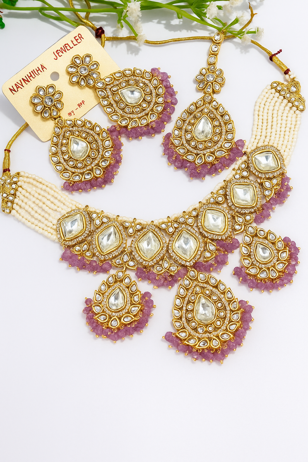 Traditional Kundan Choker Set with Purple Beaded Drops & Earrings